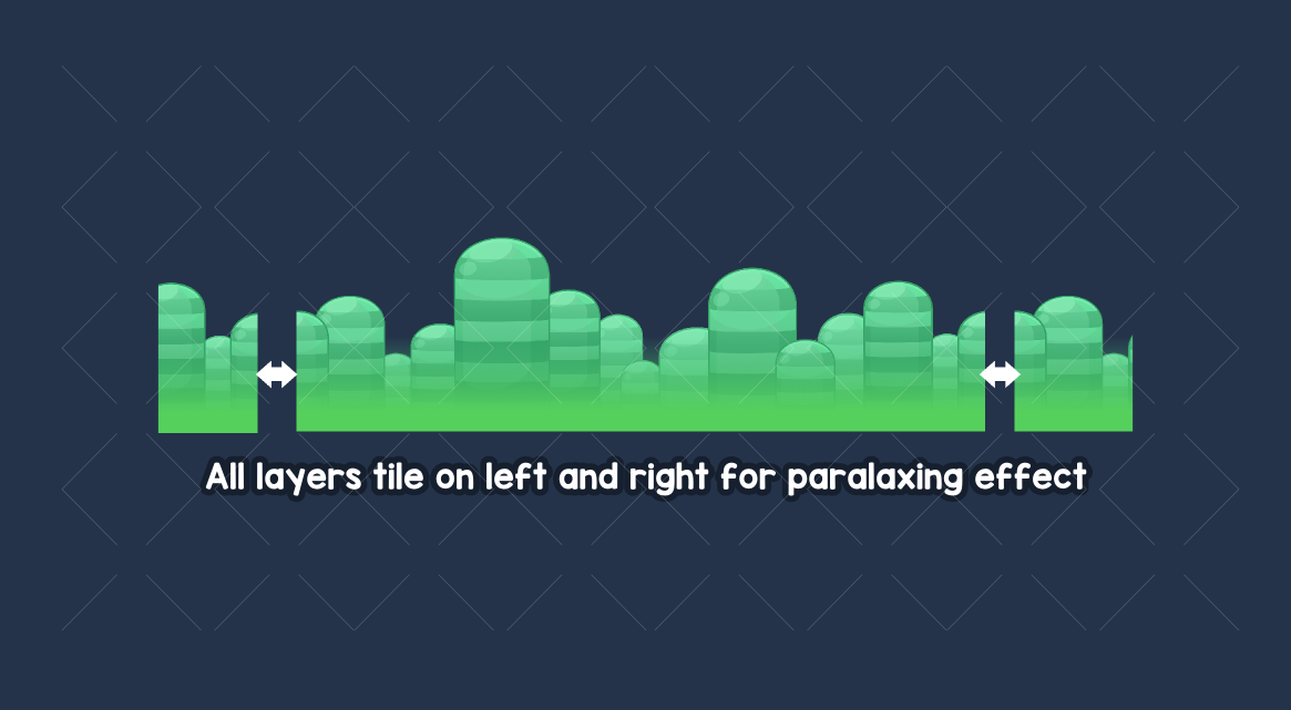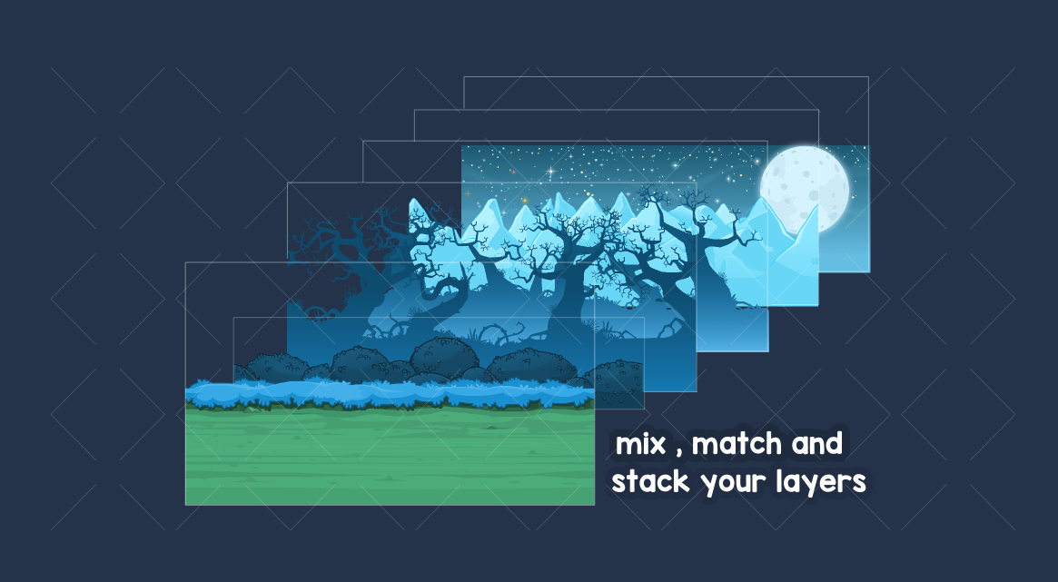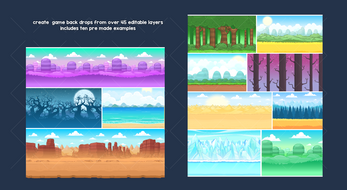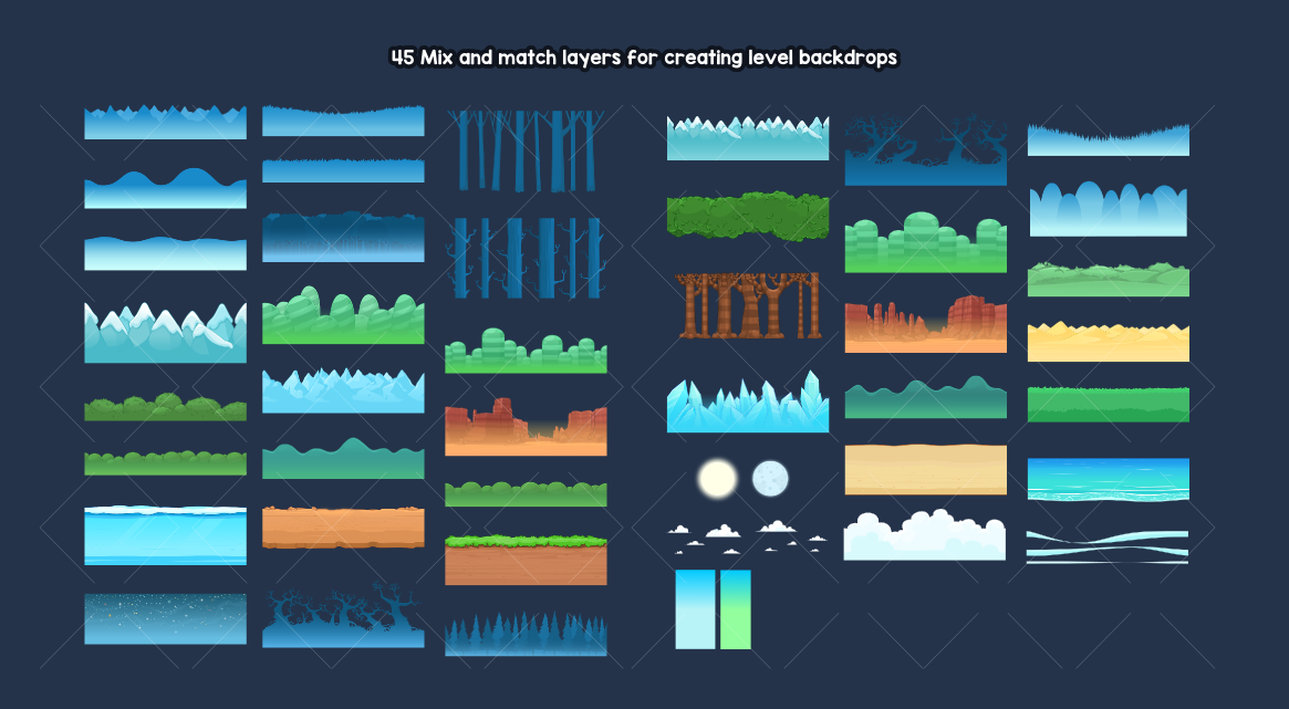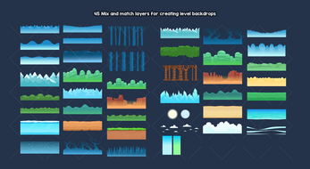 Create a huge variety of backgrounds with this large pack of parallaxing layers. Mix and match layers to create a wide range of outdoor backgrounds for any type of game. platformers, side-scrollers, or simply beautiful scenic backdrops. Each layer tiles seamlessly on the left and right sides, allowing you to build continuous scrolling scenes. Layers can be stacked to create stunning parallax effects.