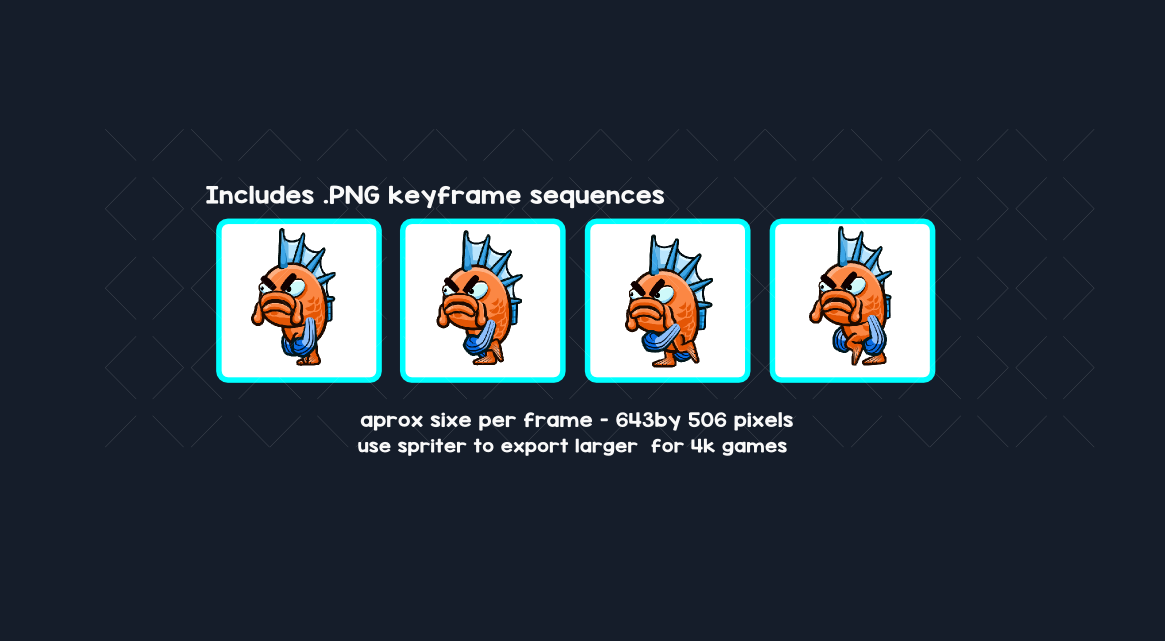 - .PNG frame sequences of all animations, each frame approx (600pxby 500px) Use Spriter to export larger frames (up to 2000 pixels before resolution loss) or use the bulk resize tool on-site to quickly reduce frames